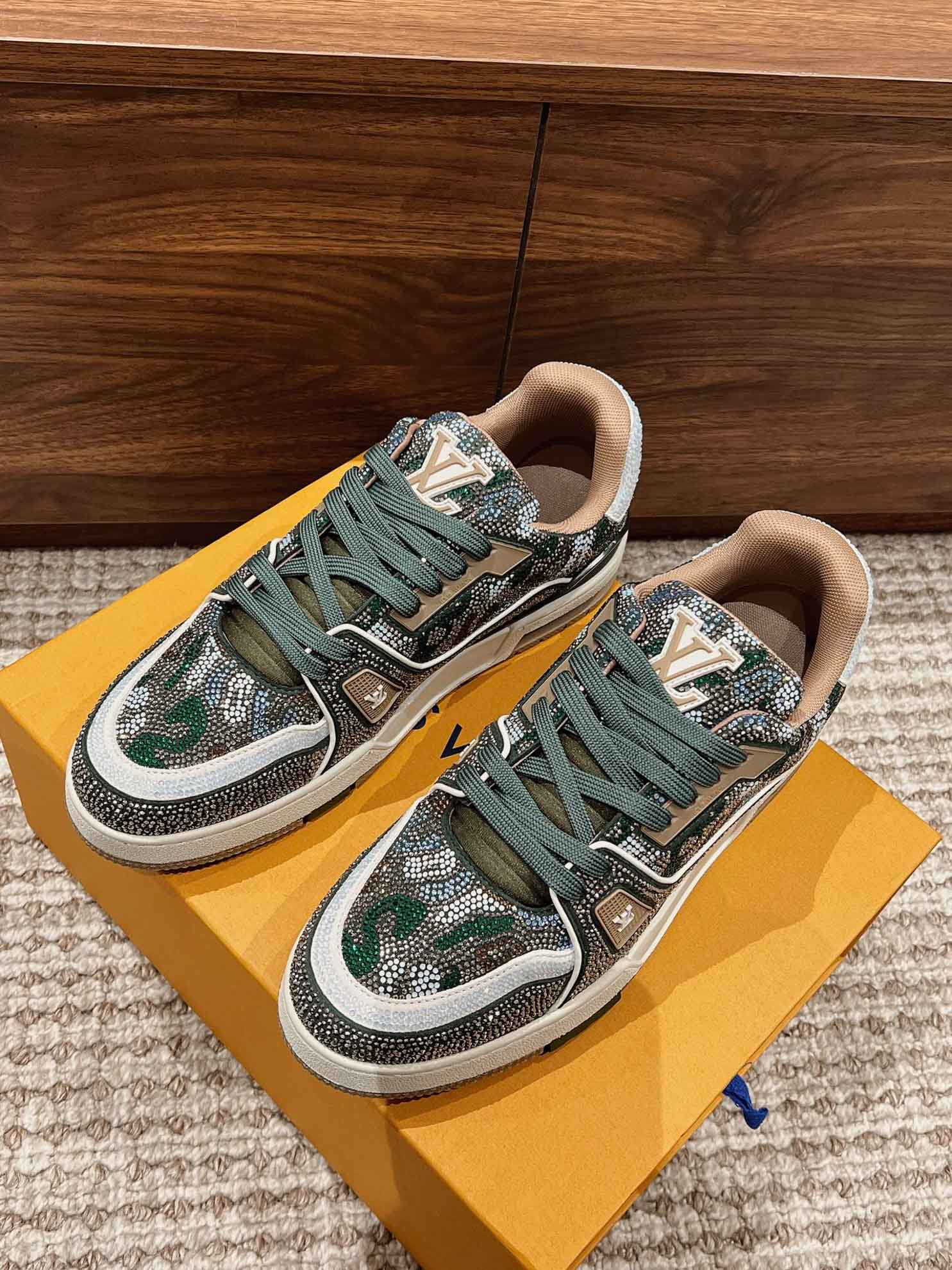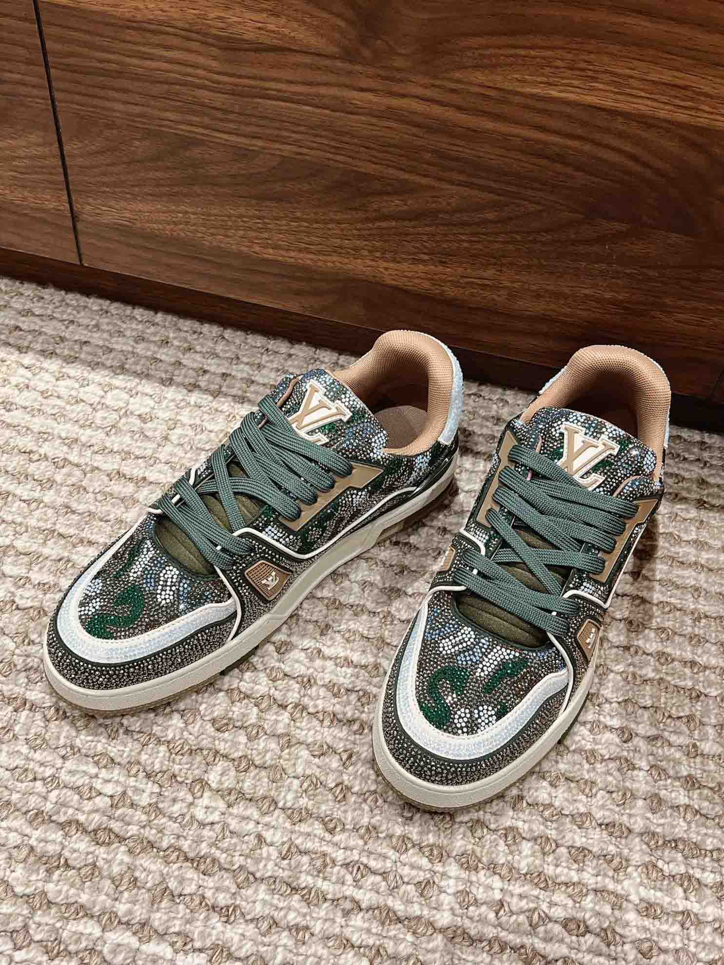 Giày Louis Vuitton Lv Trainer #54 Khaki Green Strass Best Quality
